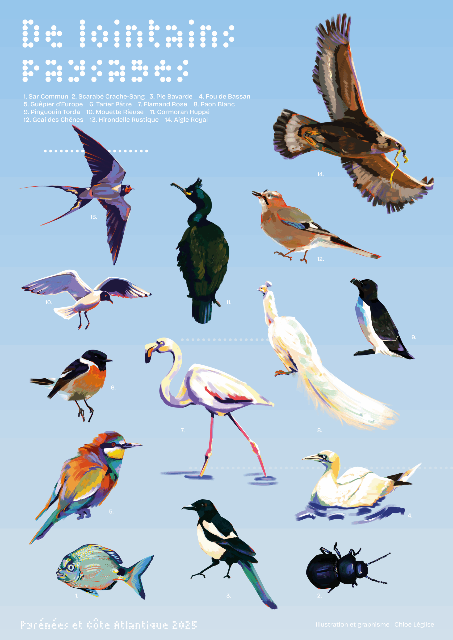 « De lointains paysages » est un projet personnel d’illustration commencé à l’été 2025, visant à dessiner les espèces d’oiseaux et quelques autres spécimens observés sur la côte Atlantique Française, des Pyrénées à la Bretagne.