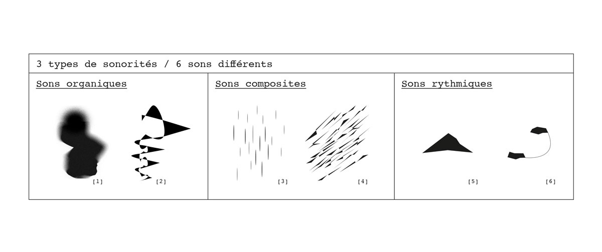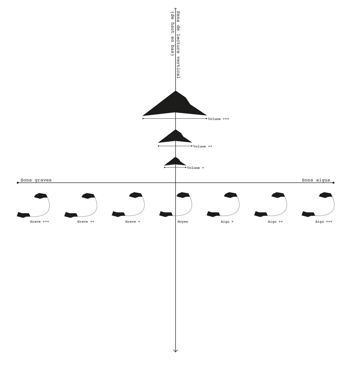 Le choix du noir et blanc permet de se concentrer sur les formes graphiques de la partition et de poser l’atmosphère générale de la composition sonore. La partition indique 3 informations sur son interprétation : le temps représenté par la ligne verticale centrale, les aigües sur la partie droite de la partition et les graves à gauche, et le volume, représenté par la largeur des éléments. Le tempo n’est pas indiqué afin de laisser les musiciens choisir et se l’approprier. Les différents types de sons composites sont représentés par des signes graphiques, sans pour autant donner d’indications quant à leurs natures, laissant les musiciens les interpréter comme ils le souhaitent.