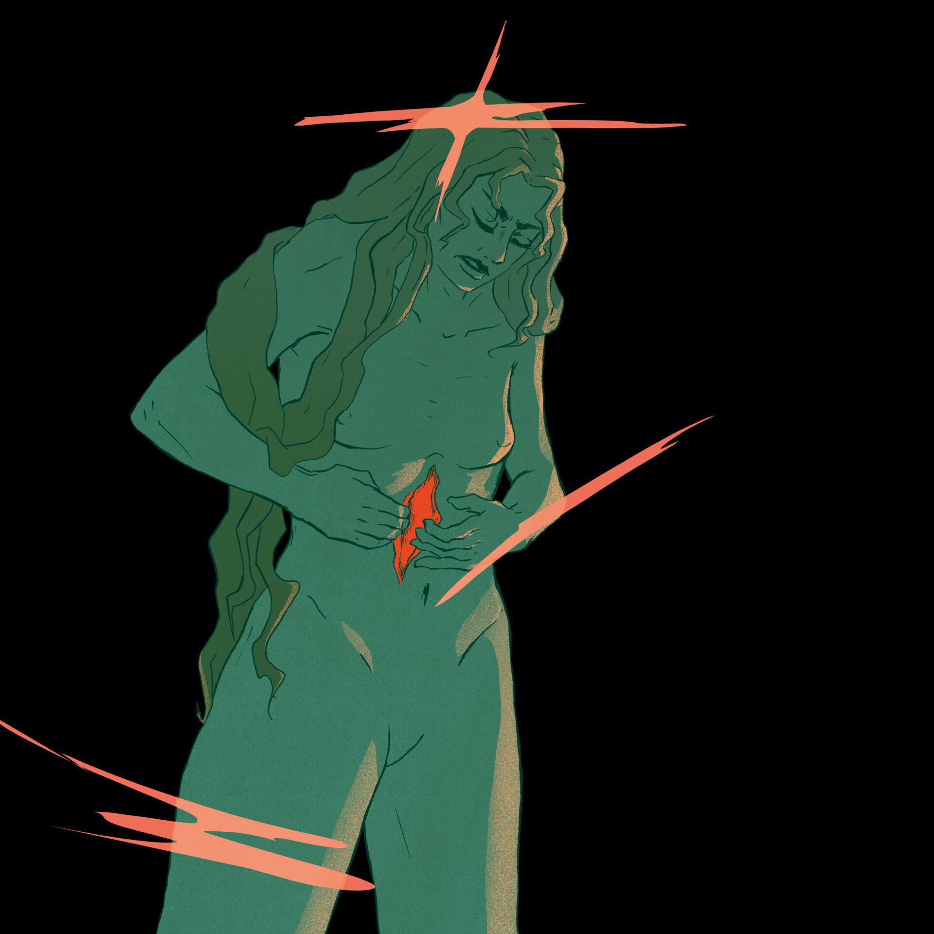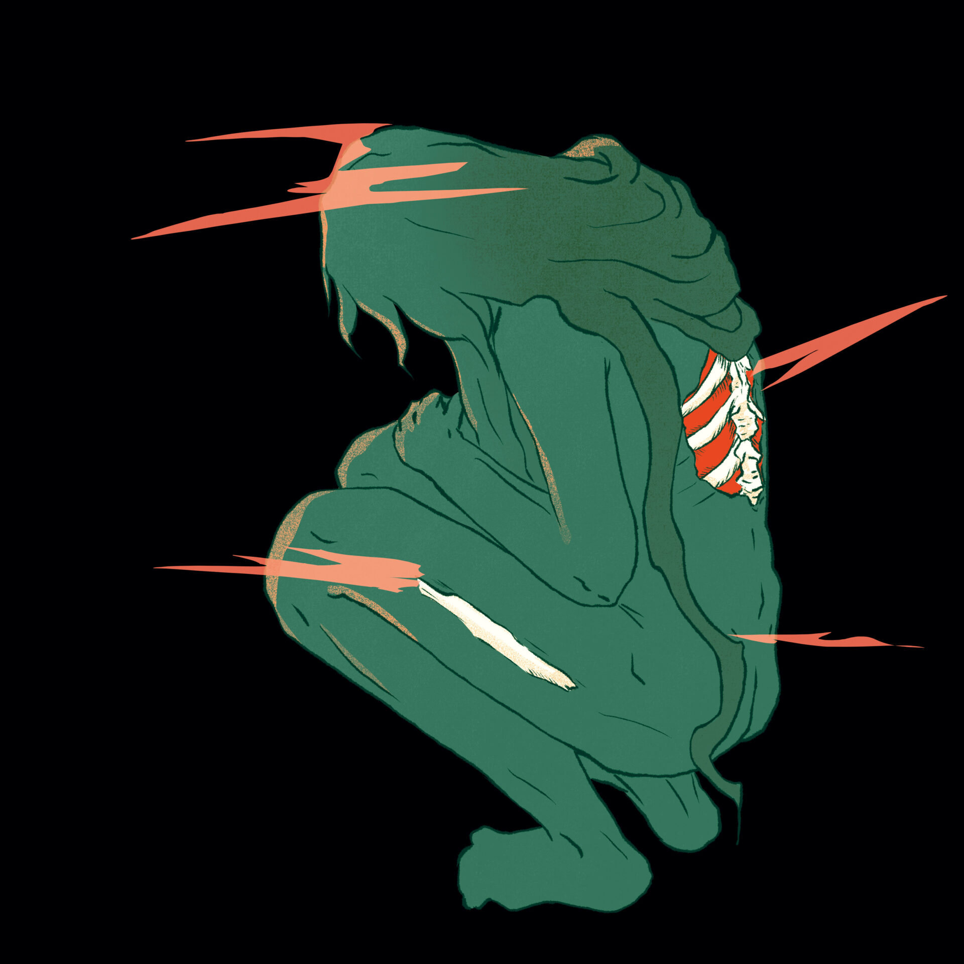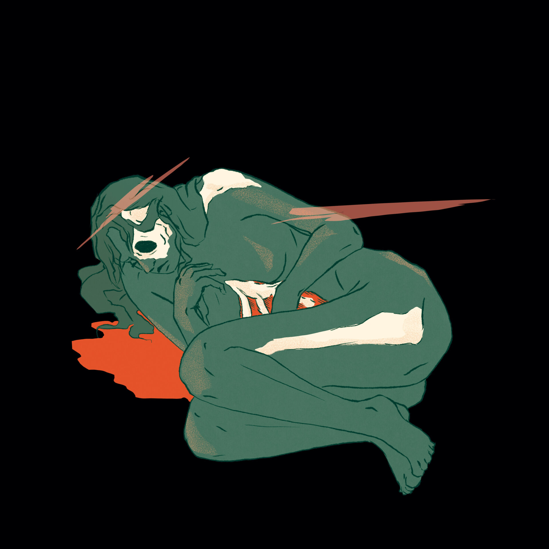 Les couleurs sont utilisées pour transmettre l’idée de dualité entre l’esprit et le corps. Le corps est d’une couleur douce, saturée mais pas trop vive. Il contraste légèrement avec l’arrière-plan, sans toutefois se démarquer excessivement. Les pensées envahissantes sont beaucoup plus vives, d’une couleur opposée à celle du corps sur le cercle chromatique ce qui attirent l’attention sur elles. Les pensées sont nettes et se propagent à tout le corps, ce qui pousse le personnage à se déchirer la peau. Cela engendre la souffrance, représentée par le rouge vif et saturé, qui attire immédiatement le regard et détourne l’attention des pensées vers les organes. La couleur de ces derniers est très similaire à celle des pensées, bien que plus saturée. Leur douleur est une conséquence directe des pensées.