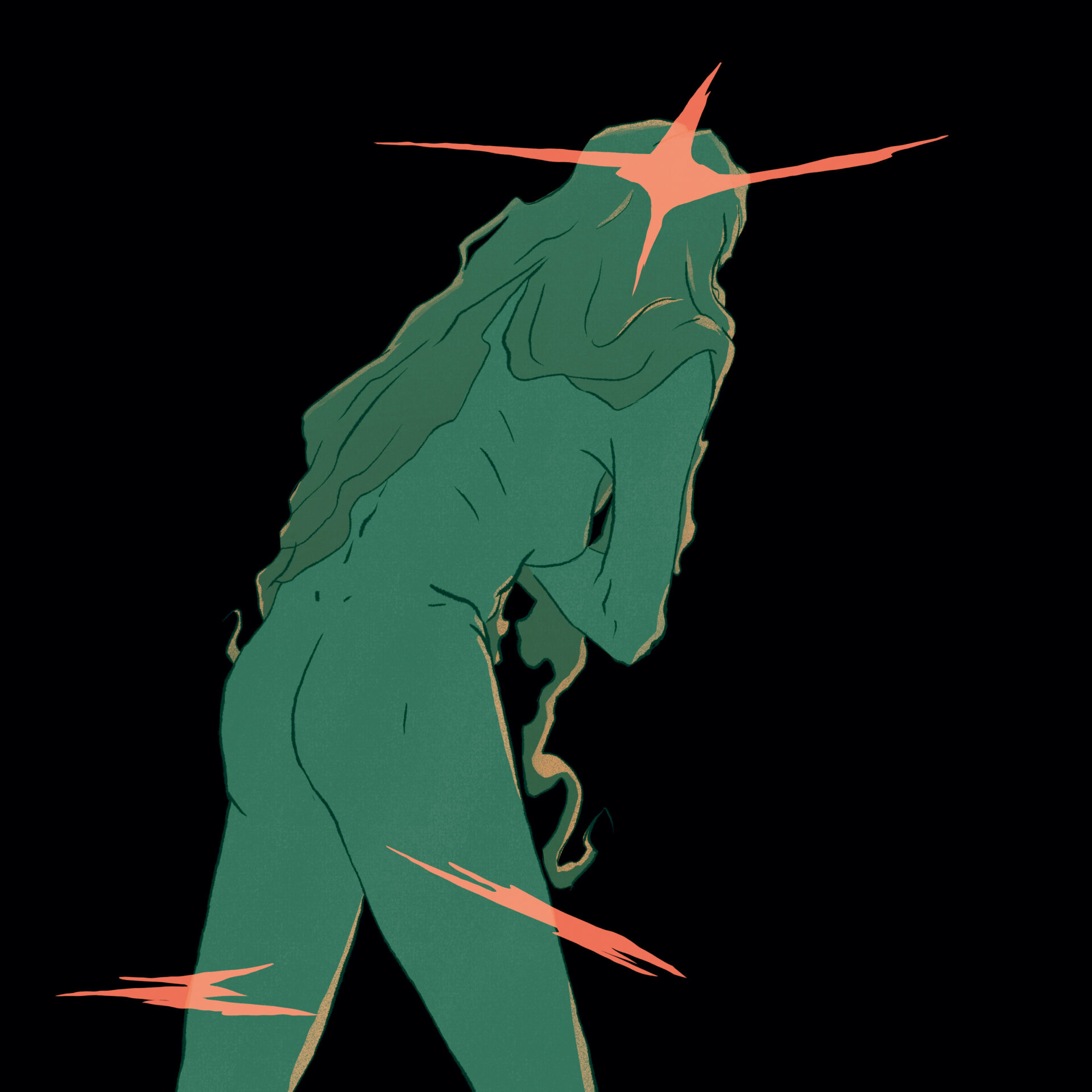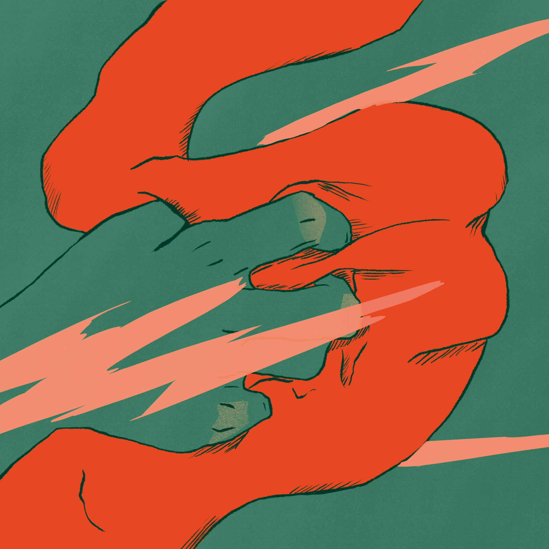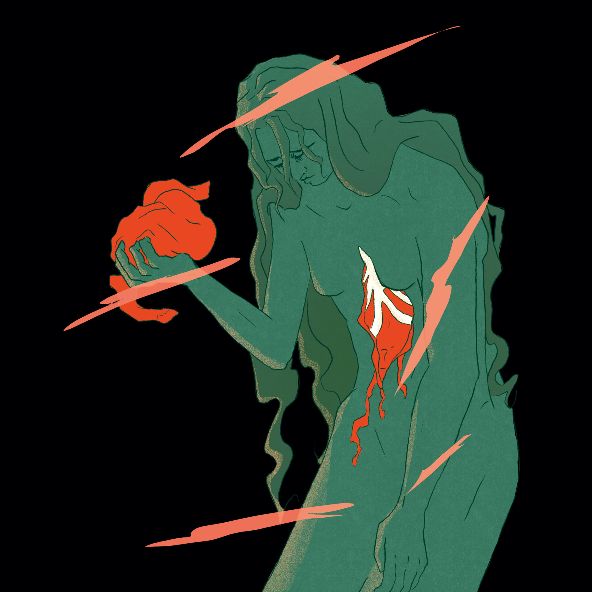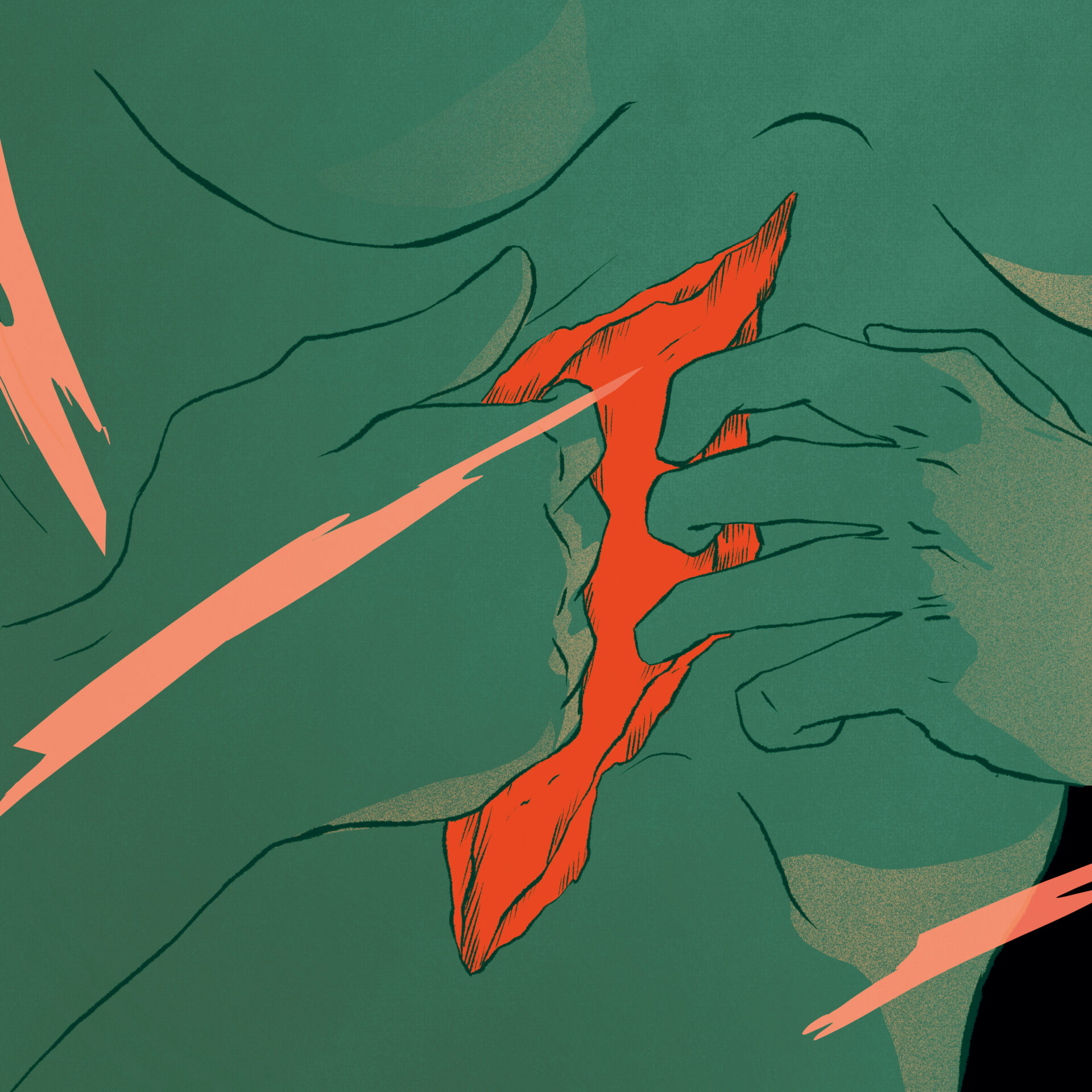 Les couleurs sont utilisées pour transmettre l’idée de dualité entre l’esprit et le corps. Le corps est d’une couleur douce, saturée mais pas trop vive. Il contraste légèrement avec l’arrière-plan, sans toutefois se démarquer excessivement. Les pensées envahissantes sont beaucoup plus vives, d’une couleur opposée à celle du corps sur le cercle chromatique ce qui attirent l’attention sur elles. Les pensées sont nettes et se propagent à tout le corps, ce qui pousse le personnage à se déchirer la peau. Cela engendre la souffrance, représentée par le rouge vif et saturé, qui attire immédiatement le regard et détourne l’attention des pensées vers les organes. La couleur de ces derniers est très similaire à celle des pensées, bien que plus saturée. Leur douleur est une conséquence directe des pensées.