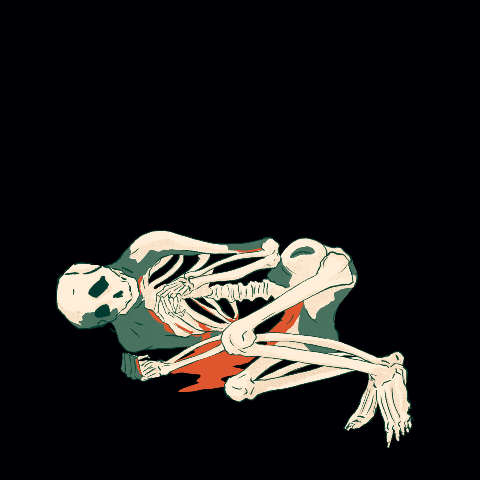 Finalement, les os apparaissent. Leur blanc attire l’attention sur eux, la détournant des organes. C’est une nouvelle étape dans l’histoire. Finalement, les pensées meurent avec le corps, et le blanc devient prédominant.