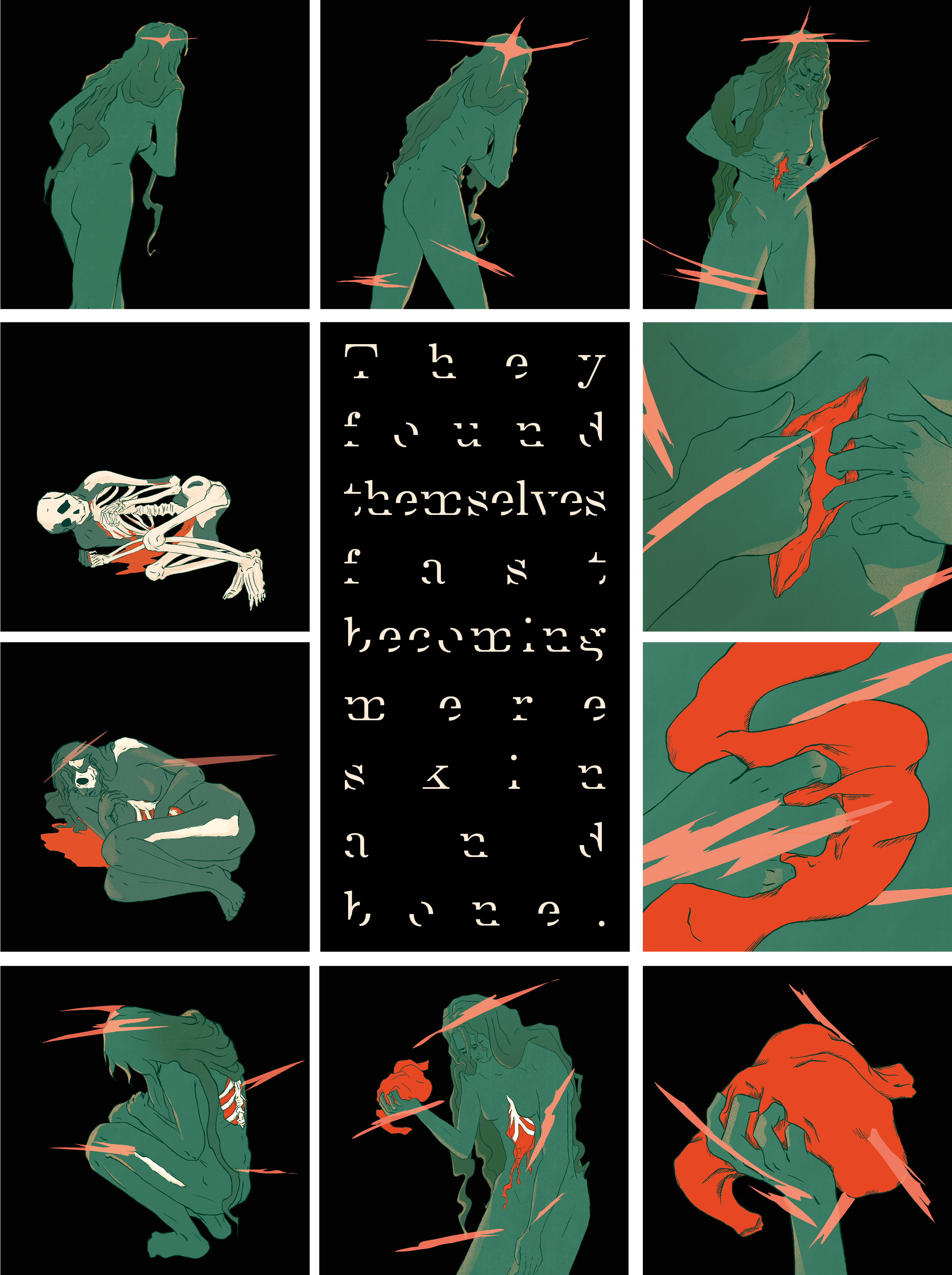 La narration suit un personnage envahi par des pensées intrusives, qui finit par s’arracher le ventre, puis par mourir lentement et devenir un tas d’os, comme dans la dernière phrase de la fable : « Ils se retrouvèrent rapidement réduits à l’état de peau et d’os. »